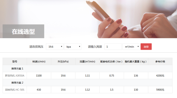 此外,還可以通過風(fēng)機選型系統(tǒng)查詢回轉(zhuǎn)風(fēng)機價格,如下圖客戶僅需輸入風(fēng)量、選擇風(fēng)壓,就可以方便、快速、準(zhǔn)確、可靠地進(jìn)行羅茨鼓風(fēng)機、回轉(zhuǎn)式鼓風(fēng)機等各類容積式風(fēng)機的選型和價格查詢工作。風(fēng)機選型系統(tǒng)地址:http://m.dtwfjx.cn/search.php